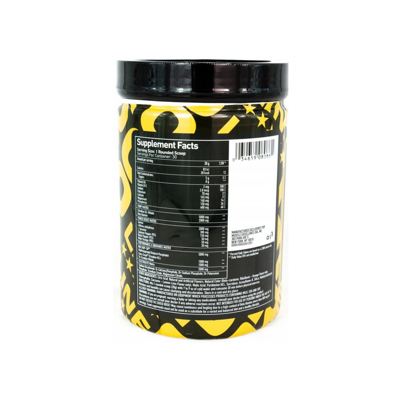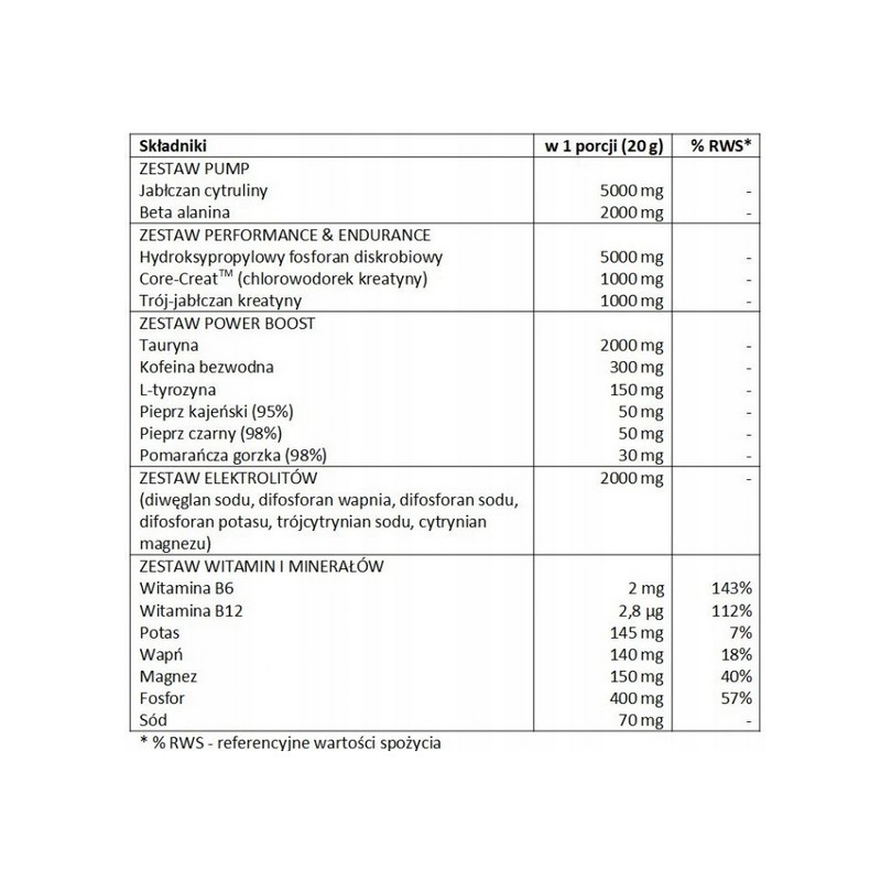 Składniki: hydroksypropylofosforan diskrobiowy (HDP), jabłczan cytruliny, beta alanina, tauryna, węglany sodu, chlorowodorek kreatyny, jabłczan kreatyny, regulator kwasości - kwas cytrynowy, aromaty, kofeina bezwodna, L-tyrozyna, fosforany wapnia, fosforany sodu, fosforany potasu, cytryniany sodu, magnez - cytrynian magnezu, substancja słodząca – sukraloza, barwnik - chlorofile, barwnik - kurkumina, regulator kwasowości - kwas jabłkowy, standaryzowany ekstrakt z owoców pieprzu cayenne (Capsicum annuum) zaw. 8 % kapsaicyny, standaryzowany ekstrakt z owoców pieprzu czarnego (Piper nigrum L.) zaw. 95 % piperyny, standaryzowany ekstrakt z owoców gorzkiej pomarańczy (Citrus aurantium) zaw. 6 % synefryny, substancja słodząca - acesulfam K, substancja przeciwzbrylajaca - dwutlenek krzemu, witamina B12 - metylokobalamina, witamina B6 - chlorowodorek pirydoksyny.
