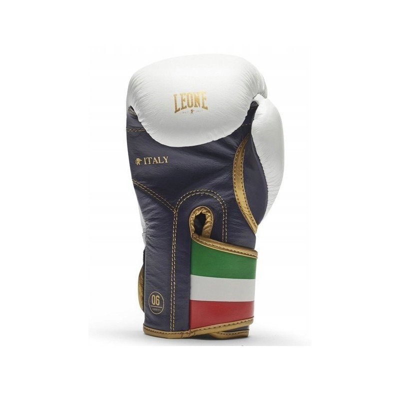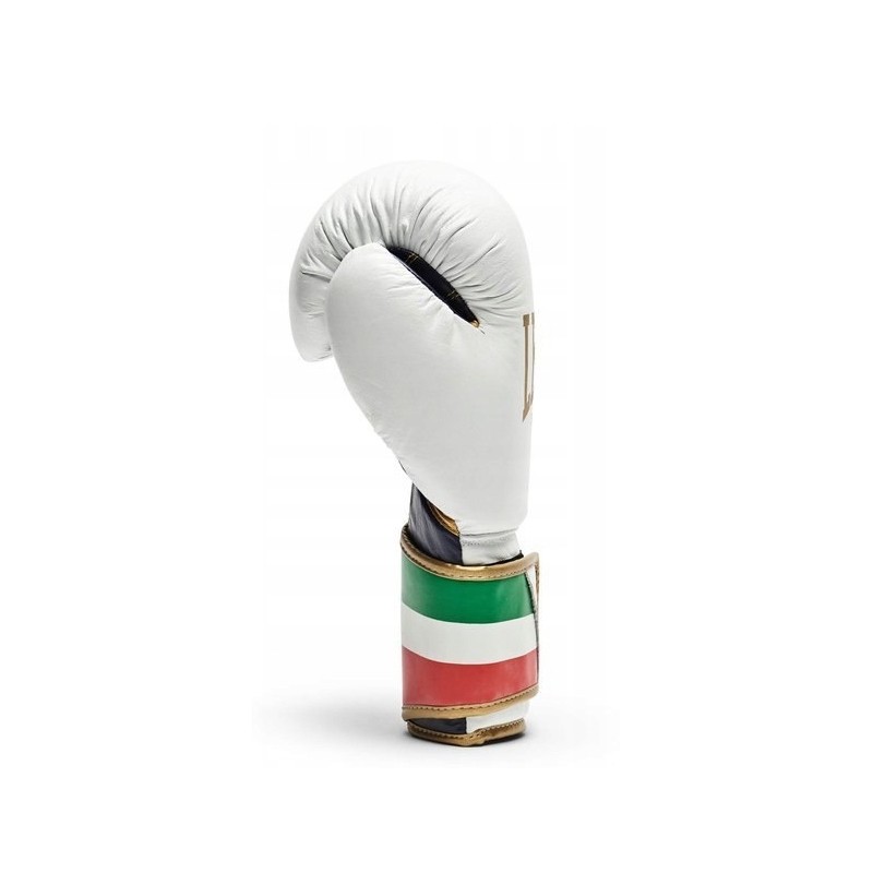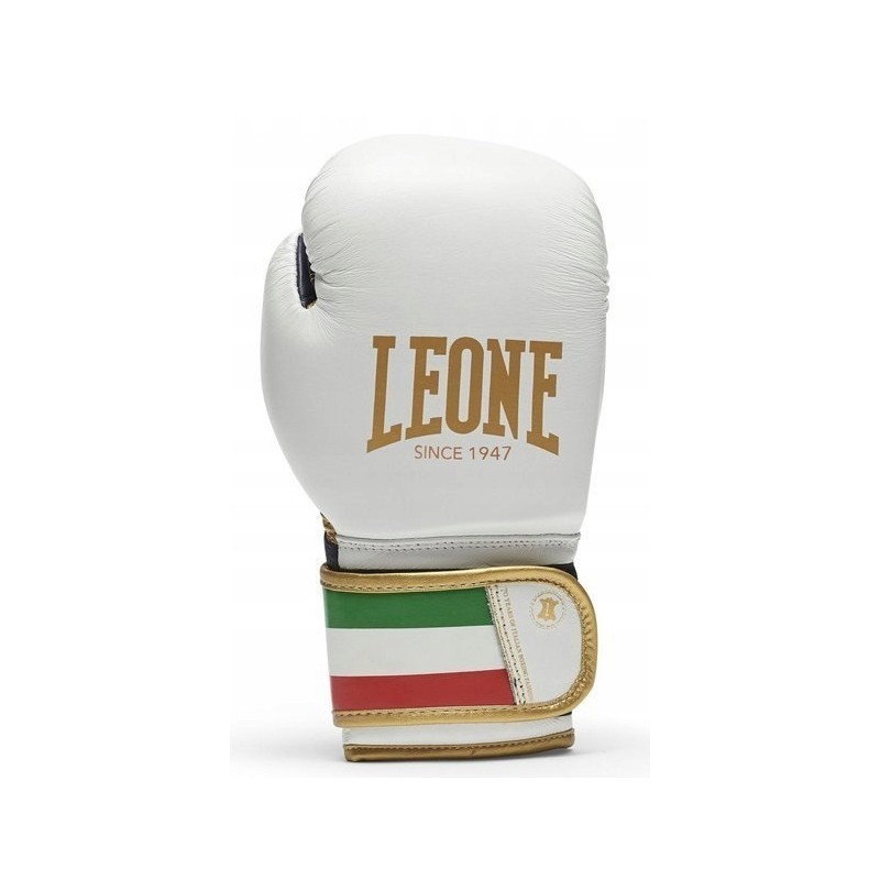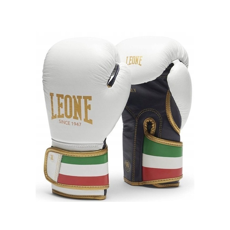 Bardzo wytrzymałe i odporne na uszkodzenia rękawice bokserskie ITALY'47 wykonany z naturalnej skóry bydlęcej. Jeden ze sztandarowych modeli włoskiej marki Leone 1947, stworzony dla wymagających fighterów. Rękawice zachwycają nie tylko najwyższą jakością wykonania, ale także oryginalnym designem. Kolor biały wraz z czarno-złotymi akcentami oraz efektownym wykończeniem w postaci zapięcia w kolorze nawiązującym do włoskiej flagi sprawiają, że model ten wyśmienicie prezentuje się zarówno podczas treningów, jak i sparingowych pojedynków na ringu.