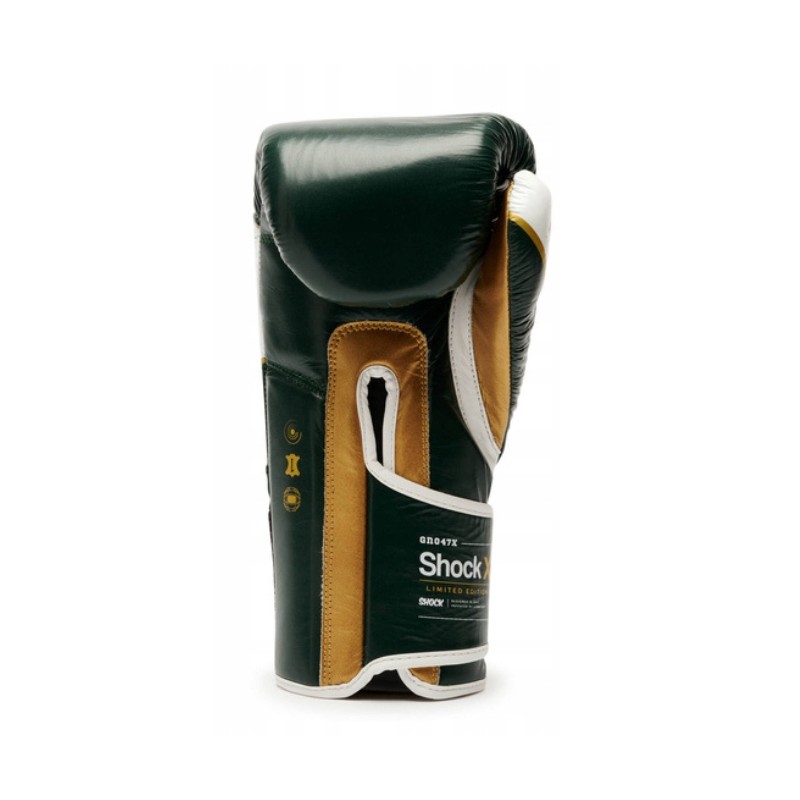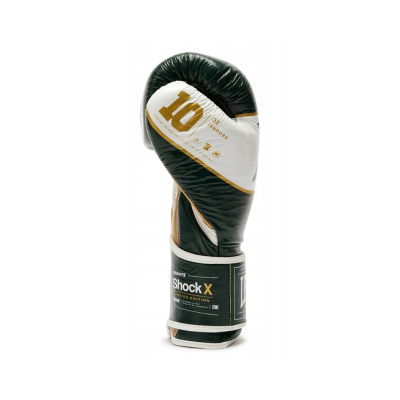 Shock X wyróżnia się eleganckim designem w kolorze zielonym, który doskonale komponuje się z elementami złota i bieli. Rękawice są dostępne w rozmiarach od 10 do 16 oz, co czyni je doskonałym wyborem zarówno dla zawodowców, jak i amatorów.